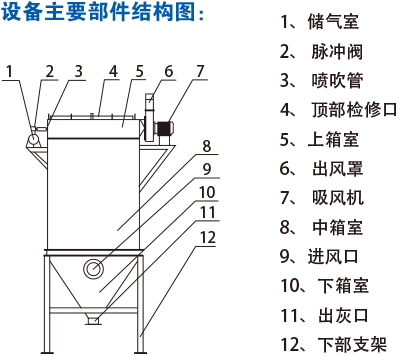 設(shè)備型號 | 處理風(fēng)量 (m3/h) | 過濾面積 (m2) | 濾袋 數(shù)量 | 過濾風(fēng)速 (m/min) | 阻力 (Pa) | 進(jìn)口 濃度 (g/m3) | 出口 濃度 (g/m3) | 清灰壓縮 空氣壓力 (MPa) | 脈沖閥 數(shù)量 |