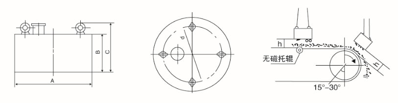 型號(hào)> 冷卻方式 適應(yīng)帶寬 mm 額定高度 mm 磁場(chǎng)強(qiáng)度 mT 勵(lì)磁功率 kw 適應(yīng)帶速 ≤m/s 外形尺寸mm φD×B 重量