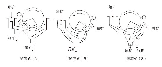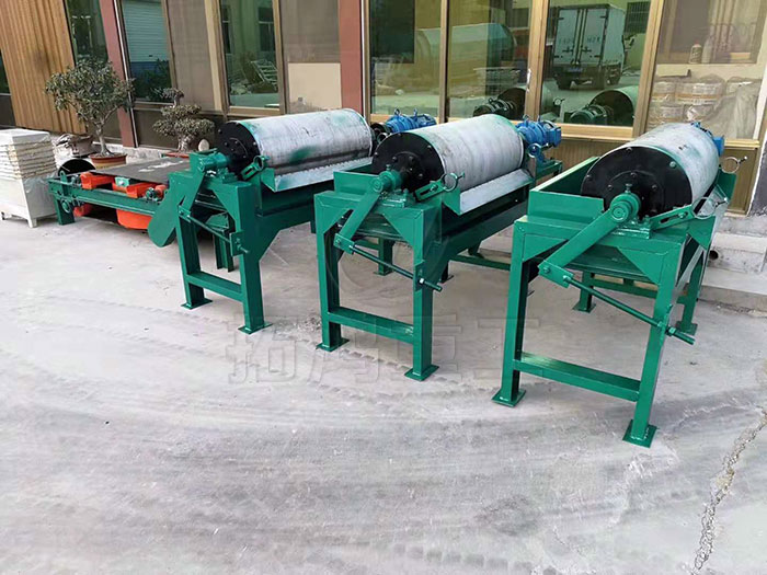 CTS、CTN、CTB系列永磁筒式磁選機(jī)磁場分旋轉(zhuǎn)式、固定式兩種機(jī)構(gòu),固定式主要適用于弱磁場濕式選別細(xì)顆粒的強(qiáng)磁性物質(zhì),或者除去非磁性礦物中的強(qiáng)磁性礦物,當(dāng)漿流入磁場區(qū)時(shí),其中強(qiáng)磁性礦物被吸附在圓筒表面,弱磁性和非磁性礦物被分選后排除,而吸附在圓筒表面的強(qiáng)磁性礦物隨圓筒的旋轉(zhuǎn)被帶出磁場區(qū)。旋轉(zhuǎn)式適用于細(xì)粒強(qiáng)(中強(qiáng))磁性礦物的干選,由于高速旋轉(zhuǎn)的作用,使磁性顆粒的磁滾翻次數(shù)大大高于普通磁選機(jī),這對于破環(huán)磁團(tuán)聚,提高富礦比具有顯著的效果,礦物經(jīng)分選后被分離成磁性物和非磁性物兩種,分別從各自的排礦口排出該機(jī),適用于礦石粒度為0.6-6mm的粗選和精選?!?同一圓筒可配三種槽體,即順流槽(CTS)選別粒度≤6mm,逆流糟(CTN)選別粒度≤0.6mm,半逆流槽(CTB)選別粒度≤1mm。