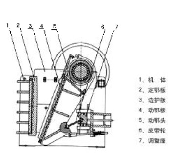 該系列破碎機工作方式為曲動擠壓型,其工作原理是:電動機驅(qū)動皮帶和皮帶輪,通過偏心軸使動顎上下運動,當(dāng)動顎上升時肘板與動顎間夾角變大,從而推動動顎板向固定顎板接近,與其同時物料被壓碎或劈碎,達到破碎的目的;當(dāng)動顎下行時,肘板與動顎夾角變小,動顎板在拉桿,彈簧的作用下,離開固定顎板,此時已破碎物料從破碎腔下口排出。隨著電動機連續(xù)轉(zhuǎn)動而破碎機動顎做周期運動壓碎和排泄物料,實現(xiàn)批量生產(chǎn)。